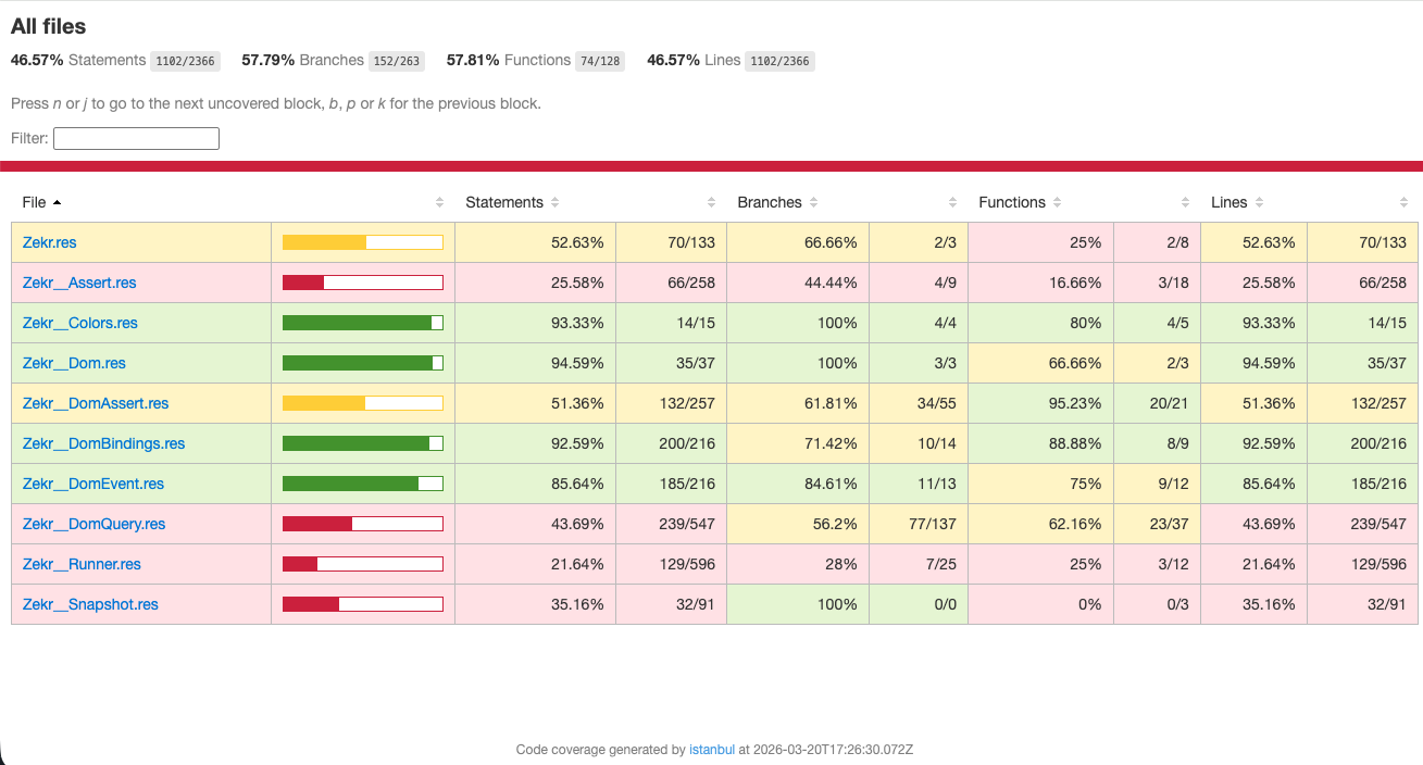 I might be bringing an old topic. I’m working on a test framework for ReScript called zekr, and I’ve been recently trying to add support for code coverage on it.