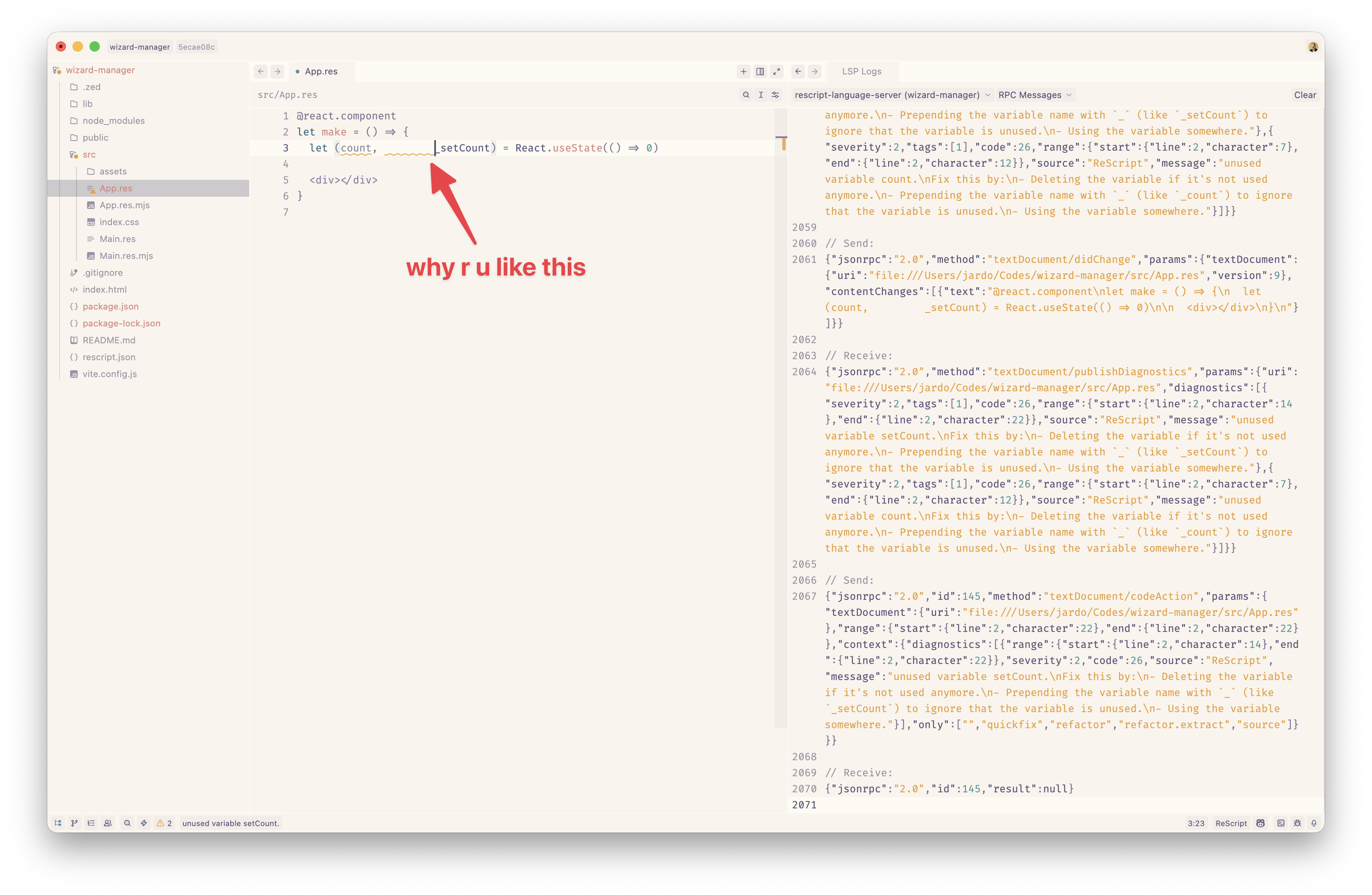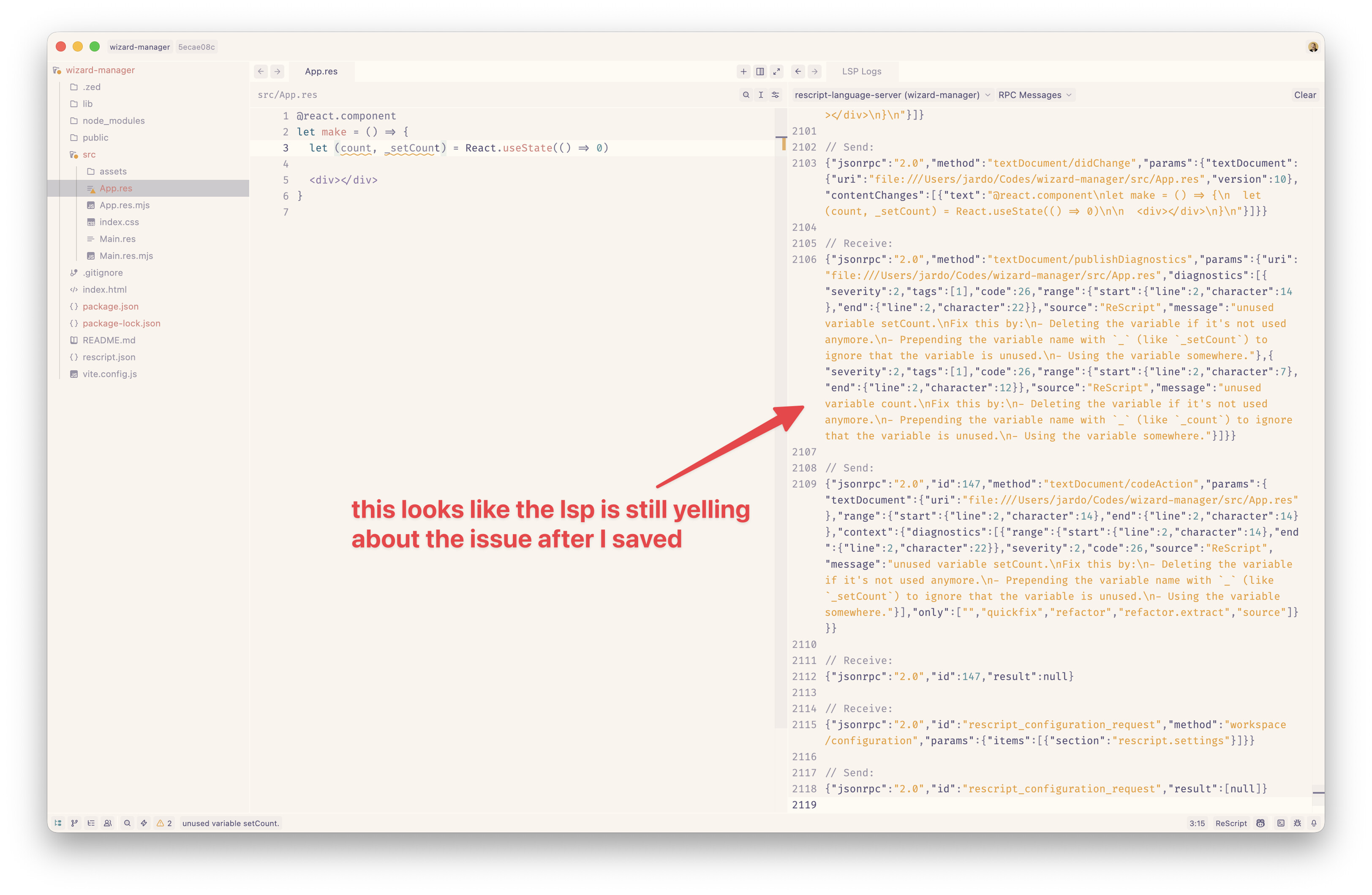 Not exactly where I should report this as I’m not 100% it’s an issue with the LSP or the editor integration or what. I’m running ReScript 12.0.1 and version 1.70.0 of the language server. When I open a file in Zed, the diagnostics that show are correct. When I change the file, the indicators showing the diagnostic issues don’t change or disappear.